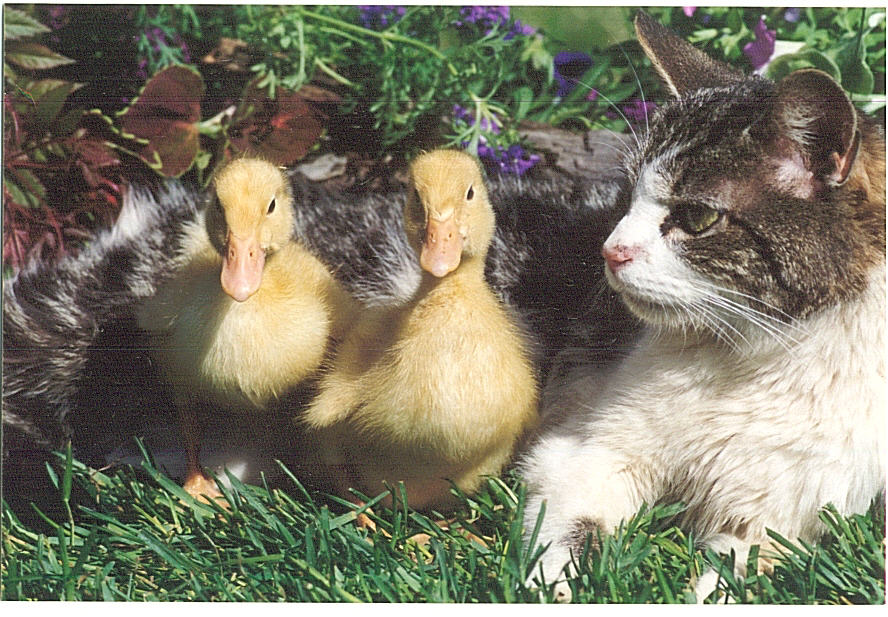 Elsie- Elsie was dumped 9 years ago pregnant. She had 4 beautiful kittens that we found loving homes for, she was then spayed. She is still with us today. Elsie was also on an American Greetings Card this Mothers Day with one of her kittens. Here she is pictured above mothering some ducklings.